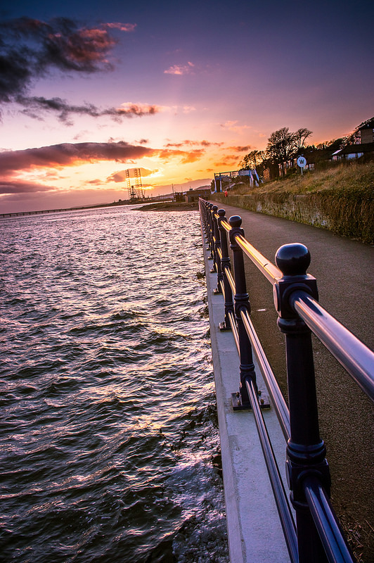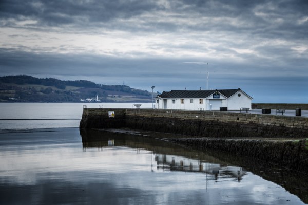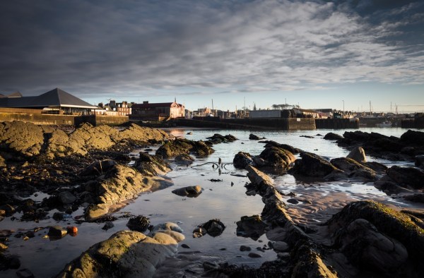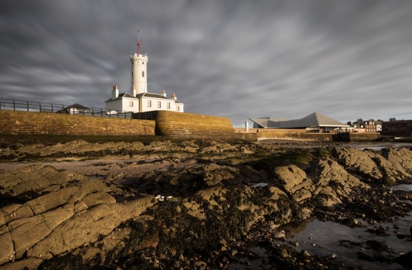 The jaggy rocks point the way towards Arbroath Harbour.