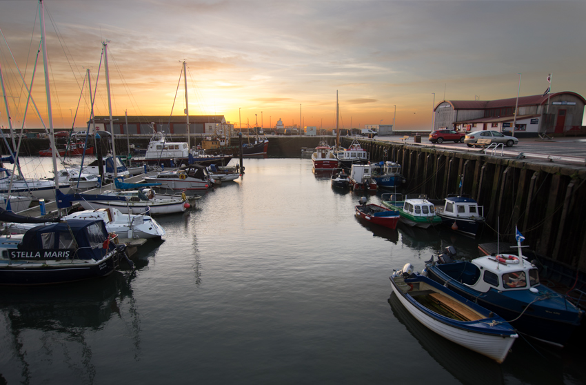 Here are two photos taken of Arbroath Harbour. The first has the boats and harbour in the foreground well exposed but the sky is totally blown out.