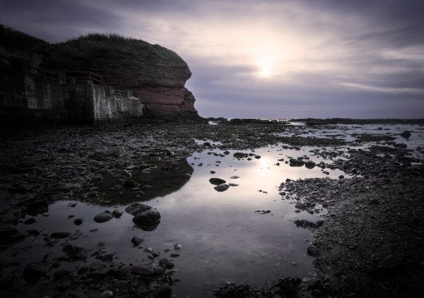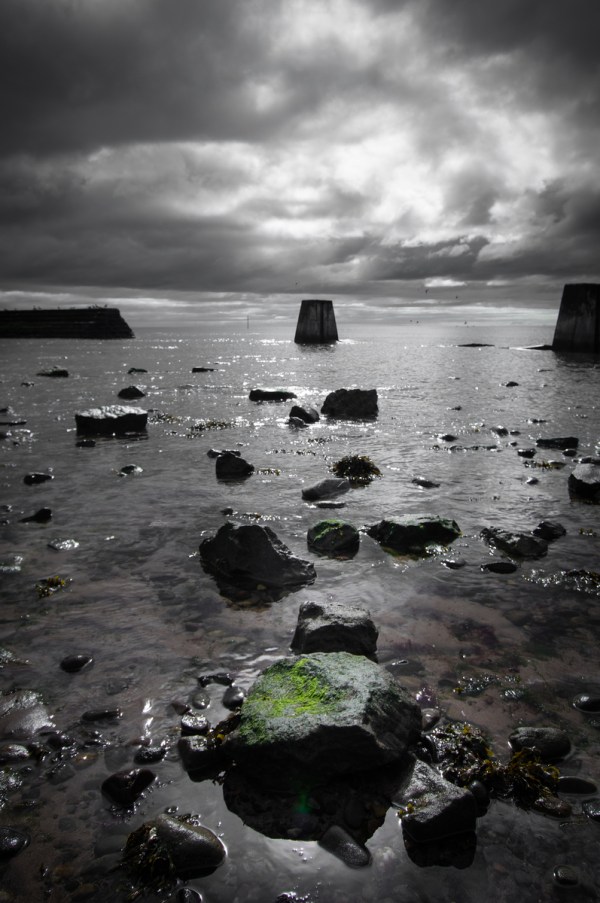 The jaggy rocks point the way towards Arbroath Harbour.